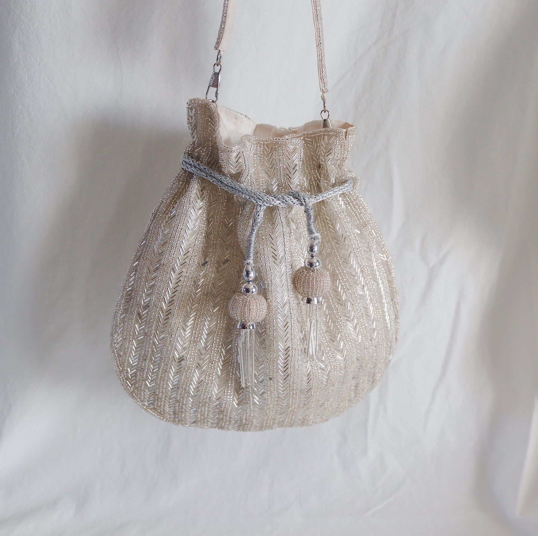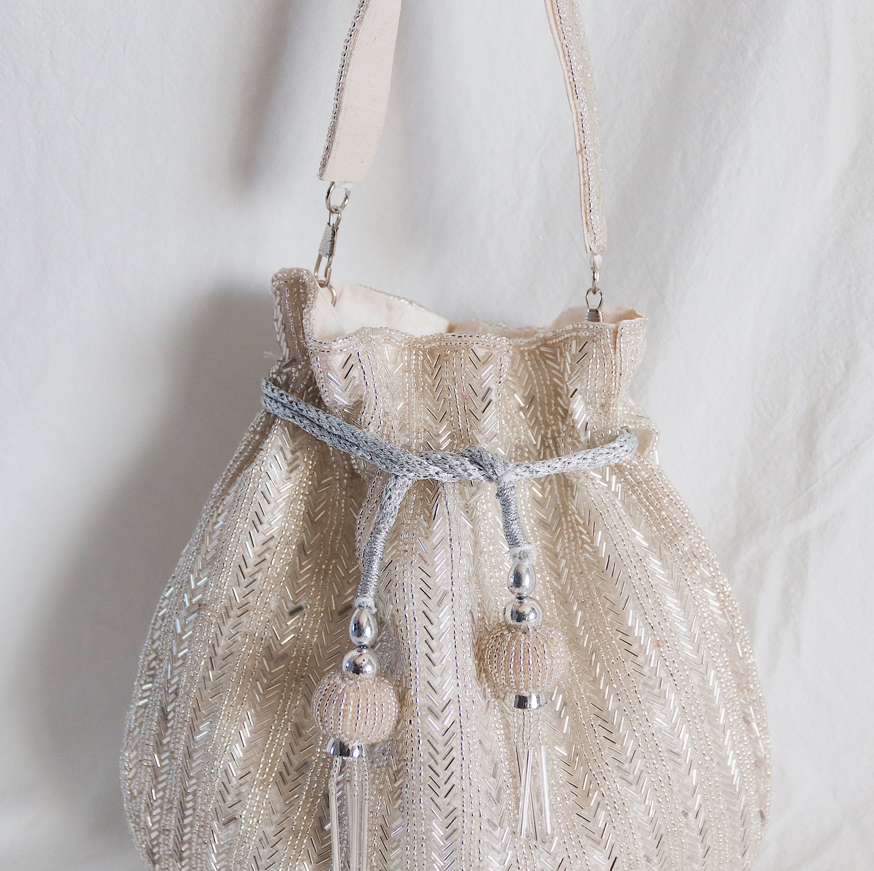 This potli features an all-over beadwork pattern that gives a beautiful textured shimmer under lights. Finished with a drawstring closure and delicate bead tassel detailing, it’s perfect for weddings, Eid celebrations, dinner events and formal occasions.