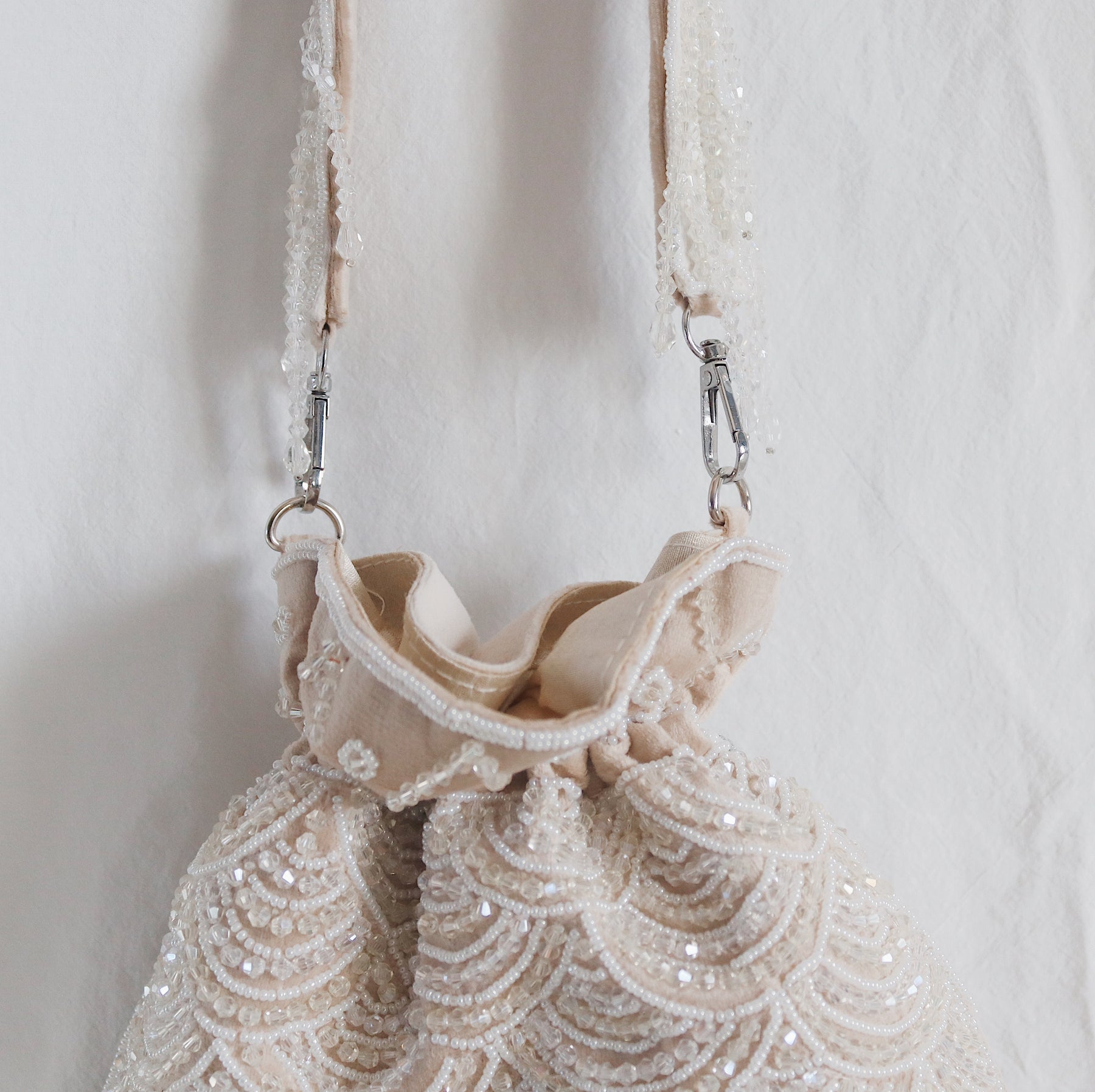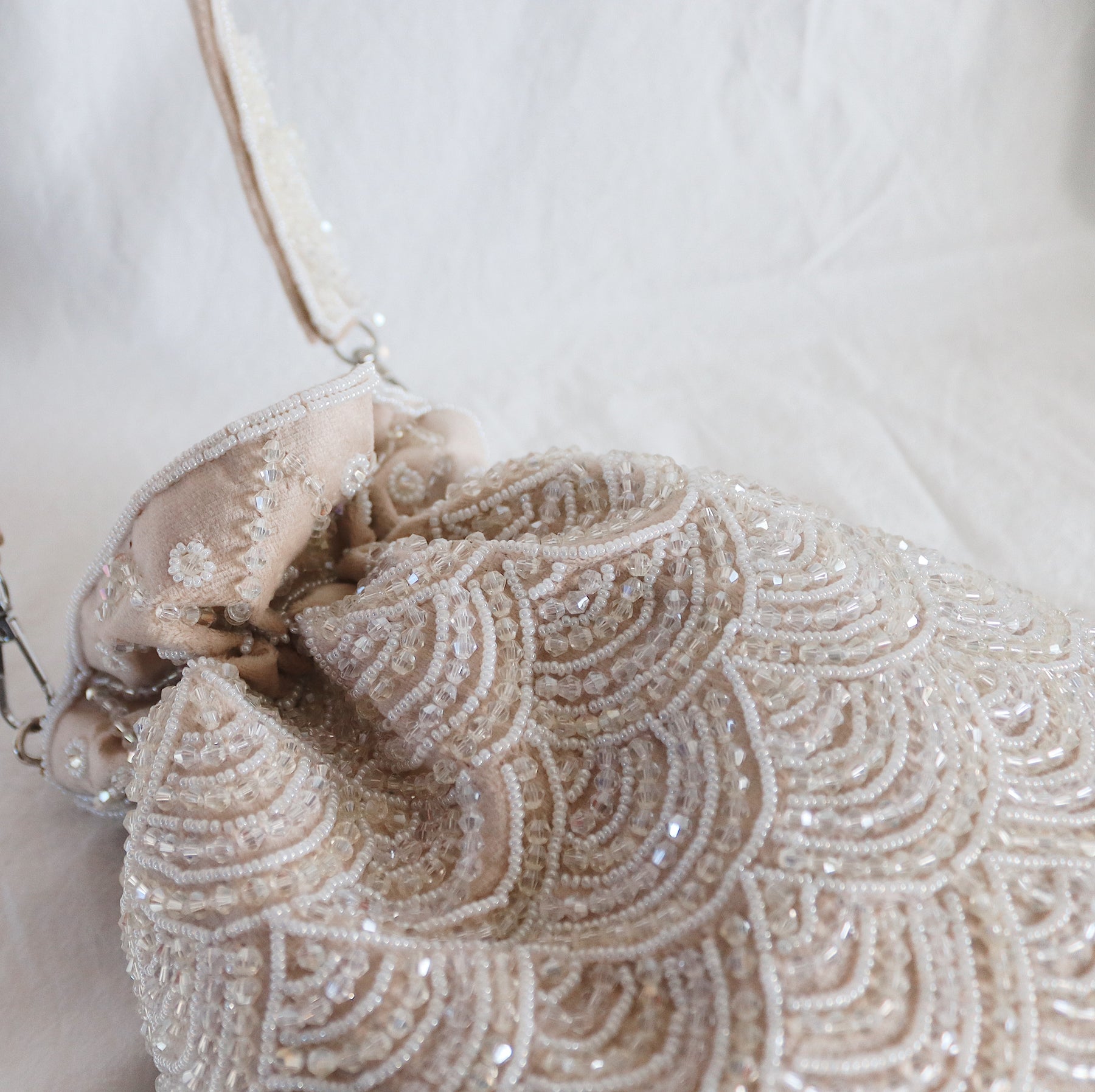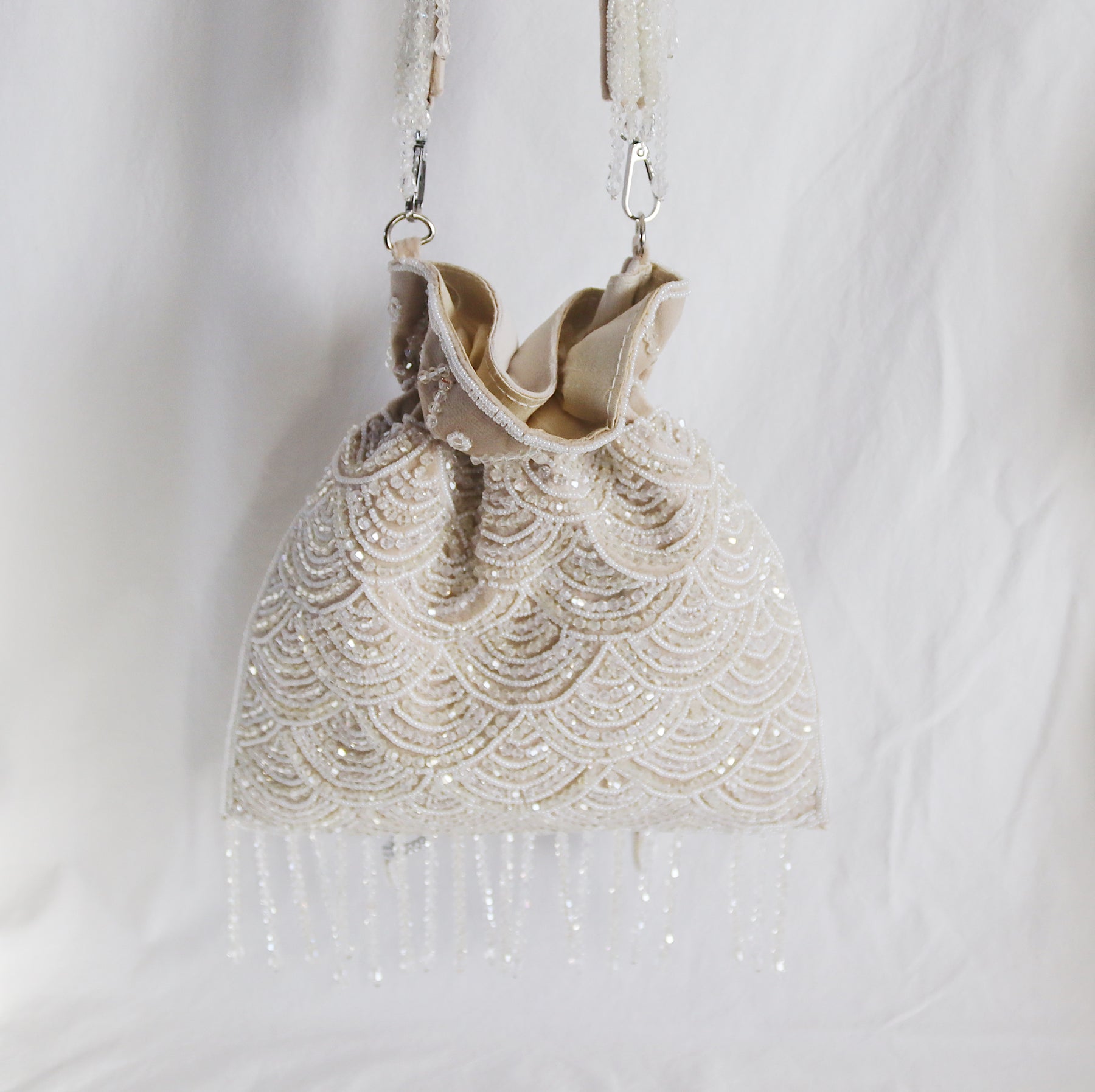 The ultimate elegant occasion bag ✨ Our White Scallop Crystal Fringe Potli Bag is designed to bring soft sparkle to your most special moments.